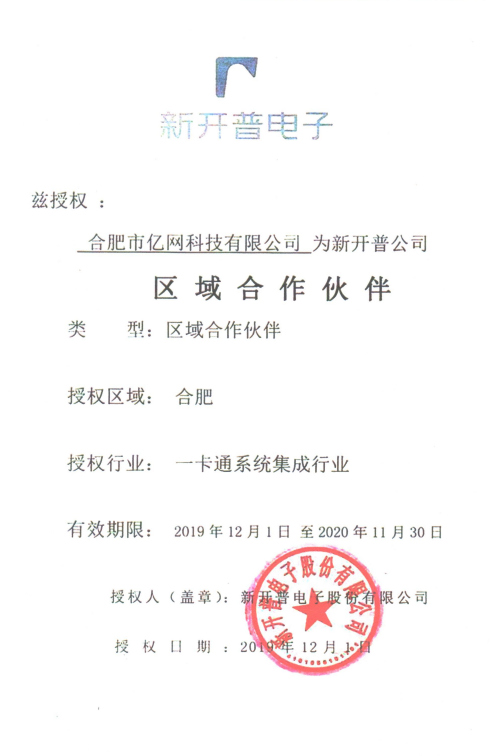 2019年12月1日合肥市億網(wǎng)科技有限公司與新開普電子股份有限公司達(dá)共識,確定了“區(qū)域合作伙伴”關(guān)系。此次關(guān)系的確立,標(biāo)志著雙方在電子智能化“一卡通”等相關(guān)領(lǐng)域的合作進(jìn)一步深化,對共同關(guān)注的服務(wù)及戰(zhàn)略更具有指向性和競爭力。今后,合肥市億網(wǎng)科技有限公司與新開普電子股份有限公司還會在同步市場更廣闊的領(lǐng)域中進(jìn)行探索,建立更加緊密的協(xié)作關(guān)系。